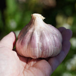 Purple stripe type garlic with a smooth, mild, flavor with a hint of sweetness. Consistent producer of good-sized bulbs with red-streaked wrappers.