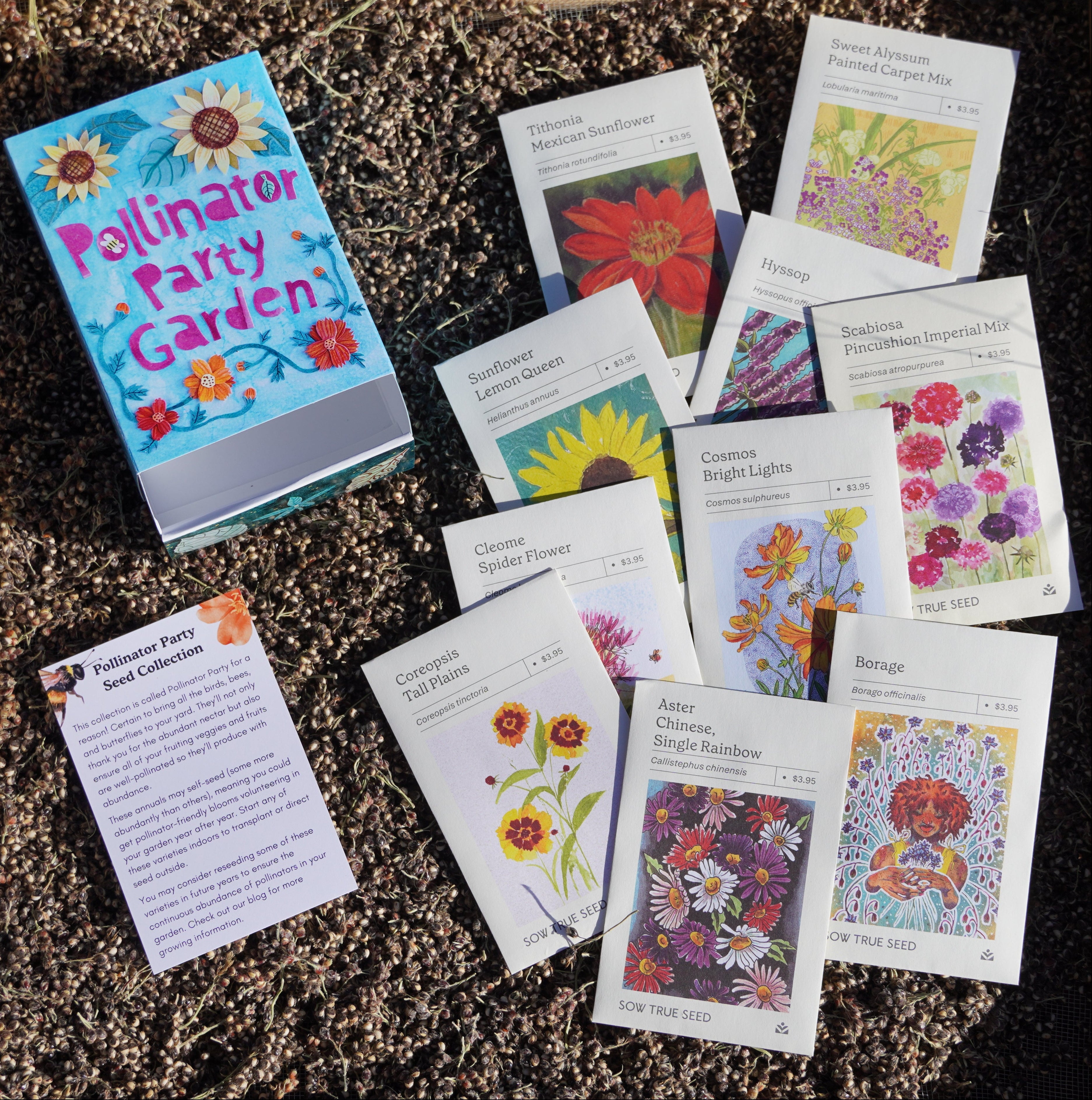 Collection contains one packet each of: Single Rainbow Aster, Borage, Spider Flower Cleome, Tall Plains Coreopsis, Bright Lights Cosmos, Hyssop, Pincushion Imperial Mix Scabiosa, Lemon Queen Sunflower, Painted Carpet Sweet Alyssum, and Mexican Sunflower Tithonia.