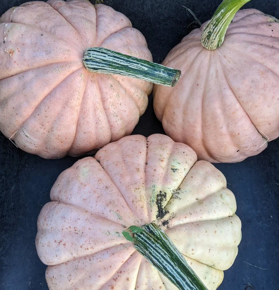 HEIRLOOM. Not to be confused with the North Georgia Candy Roaster, the NC Candy Roaster is a large and beautiful Appalachian heirloom with a superb taste, living up to its name. It grows vines with large leaves and matures lovely pinkish-orange, buttercup-shaped fruits of variable size with blue-green markings. Each vine produces one to two fruits ranging from 5 to 25 lbs. The warmth brings out its sweetness, and it does not reach full flavor potential in the cool summers of northern climates.