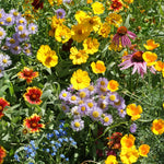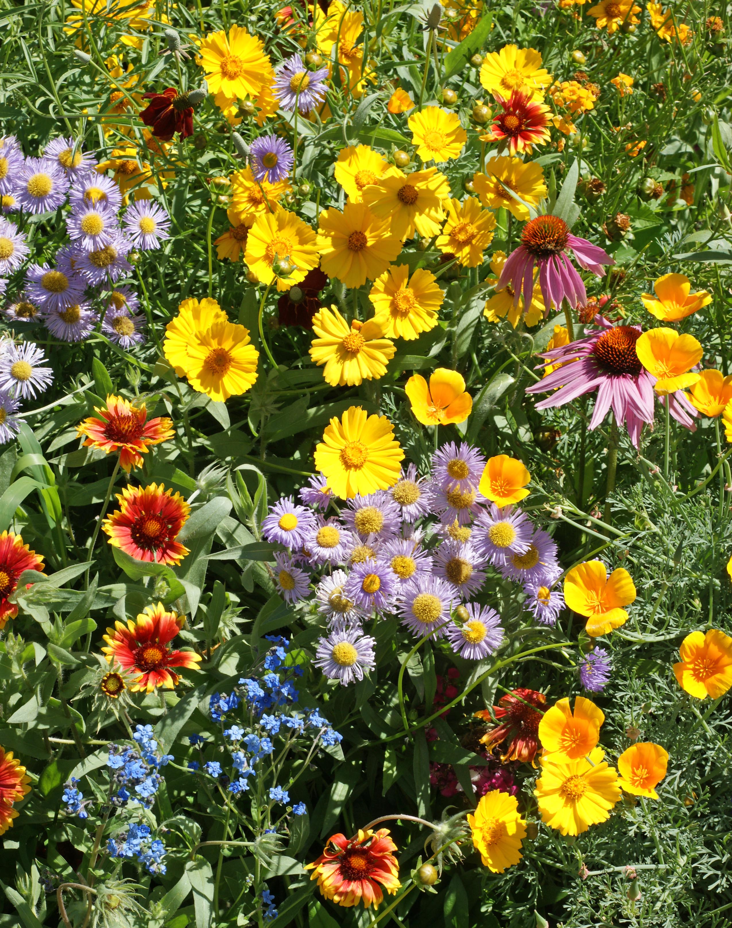 Mix Includes: Lavender Hyssop, China Aster, Siberian Wallflower, Lance-Leaved Coreopsis, Plains Coreopsis, Chinese Forget-Me-Not, Purple Coneflower, Fleabane Daisy, California Poppy, Globe Gilia, Tidy Tips, Blue Flax, Sweet Alyssum, Bergamot, Baby Blue Eyes, Corn Poppy, New England Aster.